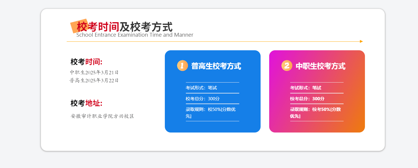 学院2026年单招/分类测验采用“文化本质测试+职业顺应性/技术测试”的分析评价体例,总分750分,此中文化本质测试(语数英合卷)300分,校考(职业顺应性/技术测试)450分,校考绩绩占比准绳上不低于50%。2026年分数线暂未发布,考生可参考往年数据合理预估:(一)往年分数线年单招预估分数线分摆布,水文取水资本手艺等专业登科门槛相对宽松,抢手专业如聪慧水利手艺、新能源汽车手艺登科分偏高。- 2024年专科批登科参考(安徽考生):聪慧水利手艺物理类417分、汗青类402分;新能源汽车手艺物理类423分、汗青类419分;工程制价物理类420分、汗青类398分。单招分数线凡是低于该批次分数,合作力更强。1。 登科准绳:按“分数优先、遵照意愿”准绳登科,不异分数按单科挨次排序(物理类:物理、数学、语文;汗青类:汗青、语文、数学),2。 校考要求:普高生加入职业顺应性测试,侧沉考查职业素养、行业认知及分析能力;中职生加入职业技术测试,侧沉专业技术实操取使用,具体测试纲领以学院官网发布为准。3。 打算申明:最终招生专业及打算以安徽省教育厅下达为准,部门专业有结合培育打算,登科后需正在指定合做院校完成学业。