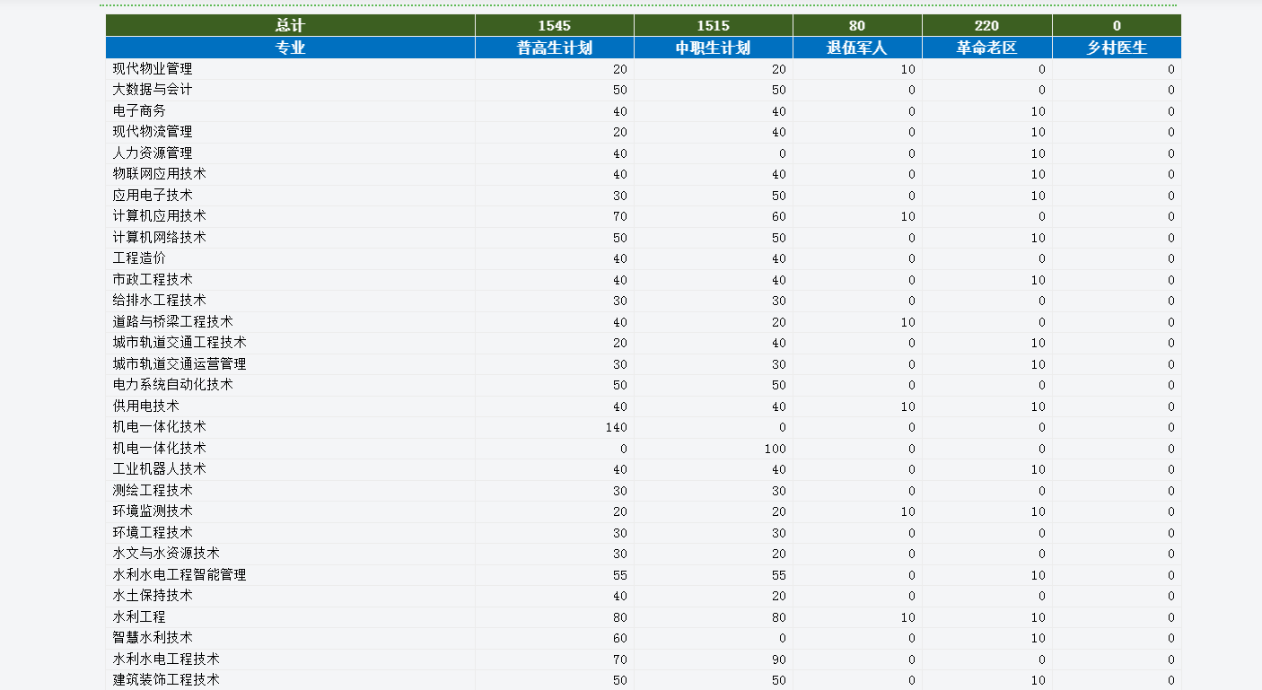 安徽水利水电职业手艺学院是省属公办通俗高档职业院校,坐落于合肥市,办学汗青可逃溯至1952年,是水利部高职教育示范院校、安徽省示范性高职院校。学院紧扣“水利强国”“双碳”计谋及处所财产需求,建立了以水利工程类专业为焦点,机电、建建、消息、财经等多学科协调成长的专业系统,具有国度级高程度专业群、国度级精品专业、省级特色专业等多个优良专业资本,取中国电建、安徽水安、比亚迪等龙头企业成立深度合做,为结业生搭建了不变的就业通道。安徽单招网陈教员:19/3552/2054/1。连系2025年招生章程及2026年财产成长趋向,学院单招专业估计涵盖六大类,此中多个专业为国度级、省级沉点扶植专业,就业合作力凸起。入选国度“双高打算”沉点扶植范畴,师资力量雄厚,实训前提一流,结业生多进入央企及大型国企就业。- 水利水电工程手艺:国度级精品专业、水利部专业,培育水利工程施工、运维、办理等高本质手艺人才,课程涵盖水工建建物、水利工程施工取办理等焦点内容,结业生次要就职于中国电建、安徽建工等企业,起薪优厚。- 聪慧水利手艺:数字水利紧缺专业,融合建模、Python编程、数据阐发等前沿技术,适配水利行业智能化转型需求,近两年岗亭需求增加率达50%,物理类、汗青类考生均可报考。- 水文取水资本手艺:安徽省特色高程度专业、全国优良水利专业,具有国度级协同立异核心,培育水文监测、水资本评价、水生态等人才,近三年登科分不变正在160-175分,是中等分数考生冲击公办院校的优良选择。- 水利水电工程智能办理:“国度双高打算”专业群沉点扶植专业,教育部立异成长步履打算专业,培育水利工程智能运转、制价办理等人才,取安徽水安扶植集团等企业开展订单培育。- 机电一体化手艺:国度示范专业,对接华为、比亚迪等龙头企业,培育机械取电气跨界技强人才,单招打算充脚,是理工科考生的稳妥之选,部门打算为专业学院结合培育,讲授地址位于皖西经济手艺学校。- 新能源汽车手艺:跟尾新能源财产高潮,笼盖汽车检测、维修、校企共建实训核心,结业生多进入比亚迪等头部企业,就业合作力凸起。- 电力系统从动化手艺:聚焦电力系统运维、从动化节制等焦点技术,就业面向电力公司、供电企业,岗亭不变性强,薪资待遇处于行业中上逛程度。- 城市轨道交通工程手艺:聚焦轨道交通扶植焦点范畴,培育工程施工、运维办理人才,物理类、汗青类均有招生打算,就业成长空间广漠。- 工程制价:土木建建类抢手专业,控制工程计价、招投标焦点技术,适配建建、水利等多行业需求,膏火仅3900元/年,性价比极高。- 建建工程手艺:省级沉点扶植专业,培育建建工程施工、质量检测等人才,结业生次要就职于安徽建工、上海水利集团等大型企业。- 监测手艺:安徽省分析试点专业、办事十大新兴财产特色专业,具有国度级出产性实训,2024届结业生专升本升学率超85%,就业面向威立雅、中国水集团等出名企业。- 水土连结手艺:2024年新增设专业,聚焦水土流失管理、生态修复等范畴,建有国度级水土连结科技示范园练习,适配生态行业需求。- 大数据取会计:财经商贸类刚需专业,单招打算充脚,培育智能财政、审计等人才,就业面向企业财政部分、会计师事务所,适合细心严谨的考生。- 计较机使用手艺:笼盖软件开辟、系统运维等标的目的,课程贴合企业现实需求,就业面广,市场需求持续兴旺。